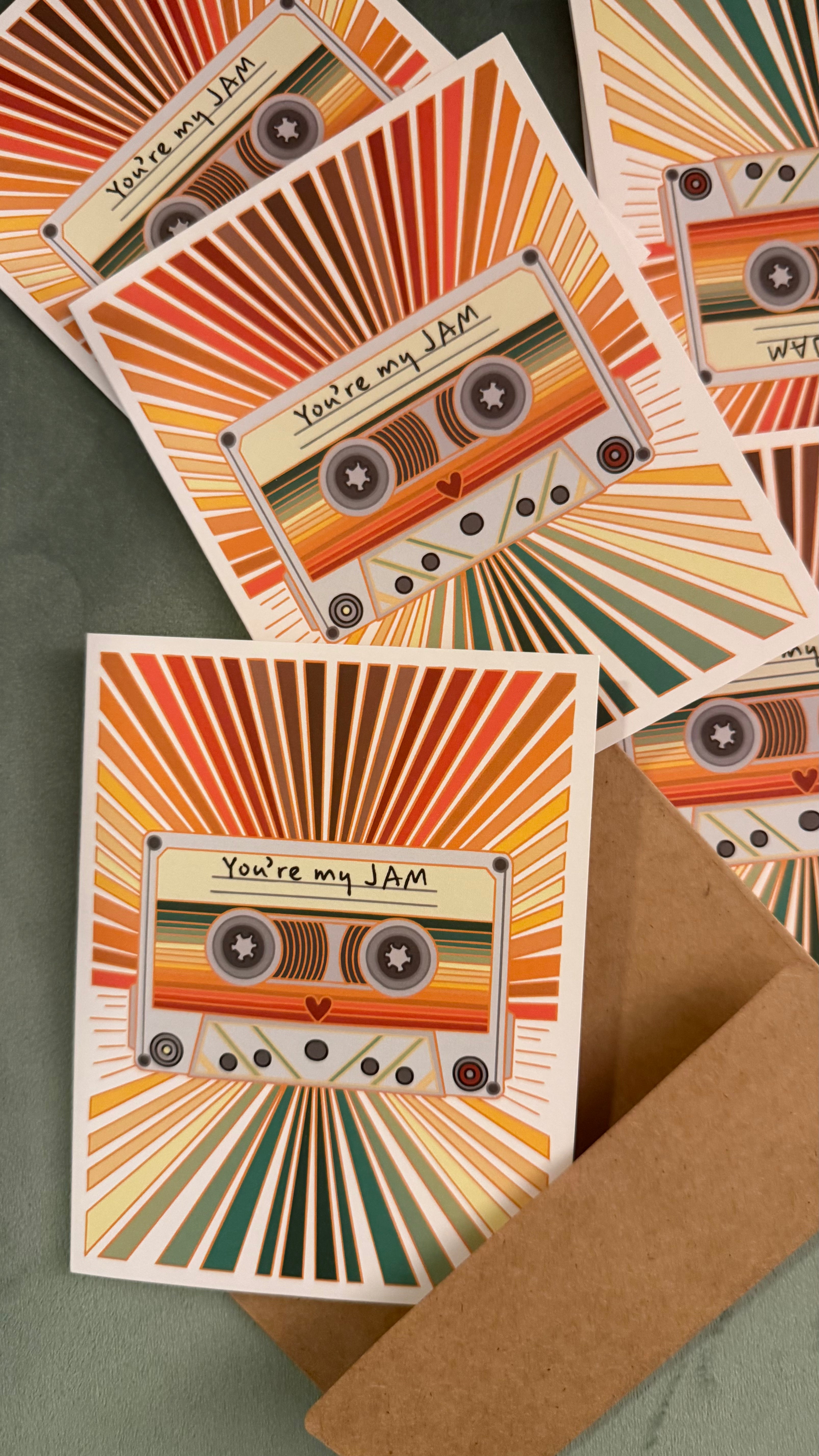 This retro cassette tape card was hand-drawn by me and is the perfect way to tell someone they’re your jam—whether it’s your partner, best friend, or fellow jam band enthusiast. Inspired by vintage mixtapes and the golden age of music sharing, this card is sure to bring a smile to anyone who loves good music.